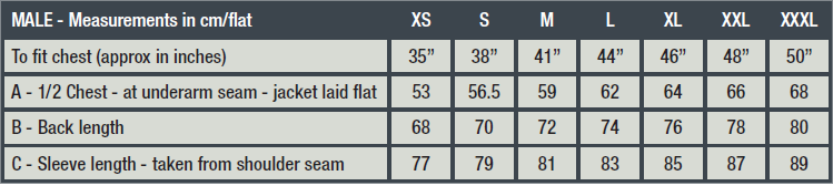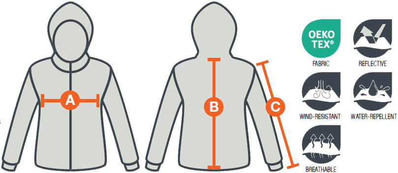 - Heat transfer reflective bands on back yoke and cuff and reflective toggles attached to all zips