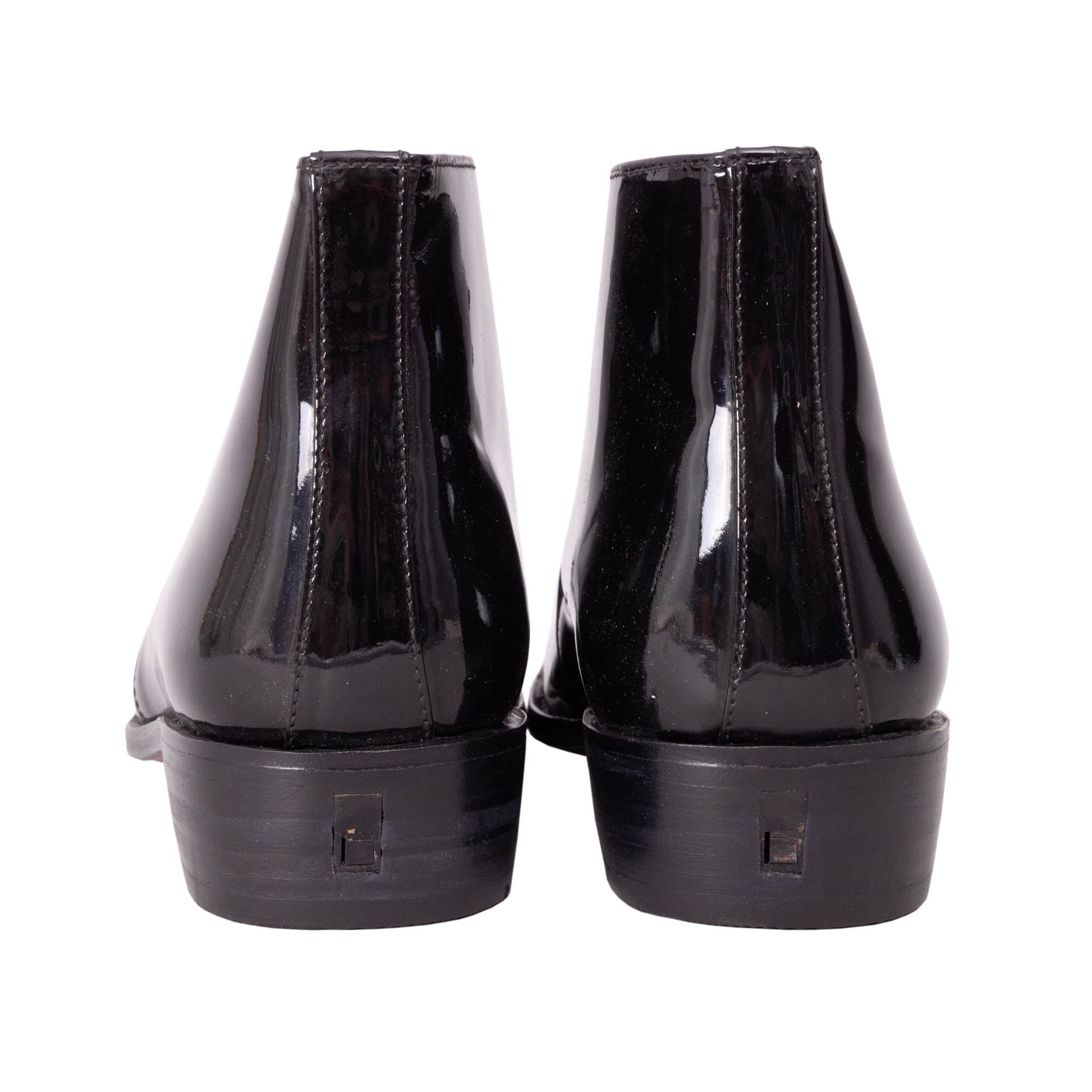 Patent leather george boot with spur boxed, leather lined with Goodyear welted sole, leather heel with a quarter anti slip rubber top piece. Complete with spur box and shoe horn.