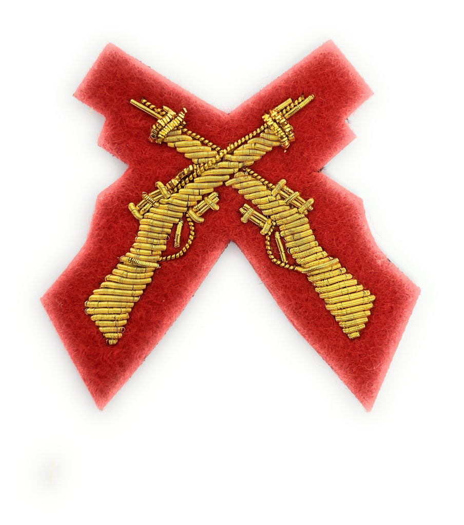 Mess Dress - Qualification Badge - Skill-At-Arms (X Rifles) - Gold on Scarlet is backordered and will ship as soon as it is back in stock.